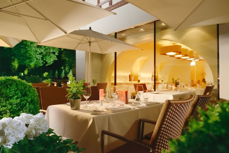 ReservierbarVegetarischRestaurant im alpenländischen Stil mit funktional eingerichteten Zimmern und einem Ballsaal mit Holzbalkendecke.